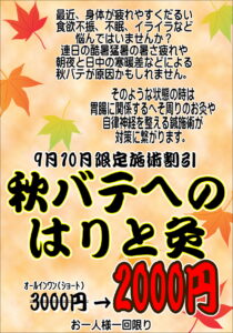 また、当院の施術でもいわゆる秋バテへの鍼灸施術もご用意していますのでご相談ご予約お待ちしております。