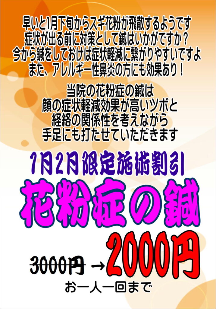 明けて早々ですが早くて一月下旬からスギ花粉が飛散するそうです。